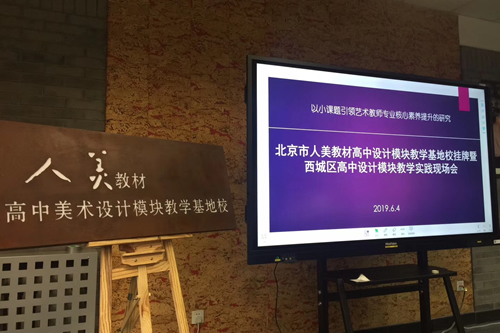 2019年6月4日上午,“北京市人美版教材高中设计模块教学基地校”挂牌仪式暨“西城区高中设计模块教学实践现场会”在我校举行。北京教育科学研究院基础教育教学研究中心美术教研员陶涛老师、人民美术出版有限公司总经理副编审黄宗亮、中国美术家协会少儿美术艺委会周殿宝副主任出席了本次现场会。参加本次会议的还有北京市各区县中学美术教研员及市区级美术学科带头人共五十余人。
