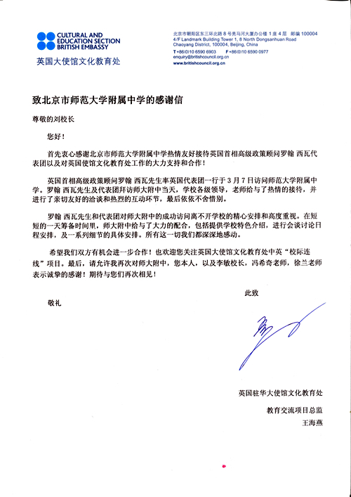致北京市师范大学附属中学的感谢信 尊敬的刘校长 您好! 首先衷心感谢北京市师范大学附属中学热情友好接待英...