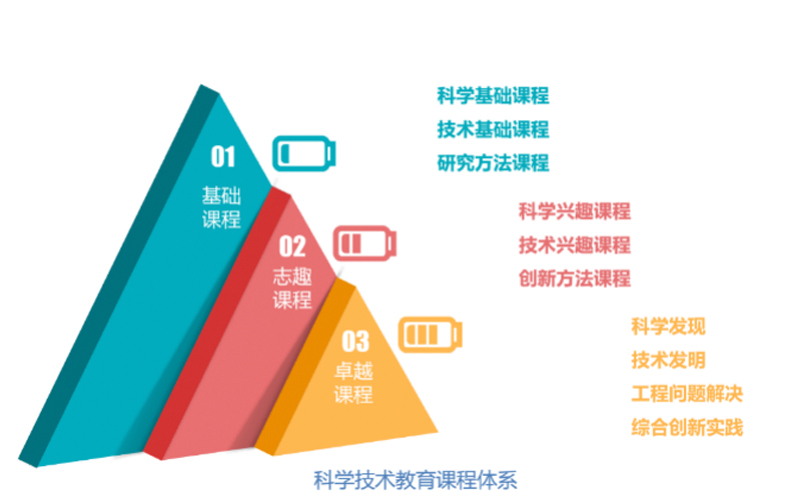 我校的科技教育课程体系中,第一类是科技基础课程,目的是培养懂科技的全体学生,同时从中发现“爱”科技的学生,进一步他们提供第二类科技志趣课程,在这部分同学中,选拔出既喜爱科技,又有潜力的同学,继续进行第三类科技卓越课程的学习,通过这类课程,培养出未来“做”科技的学生,也就是科技工作者们。