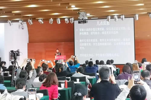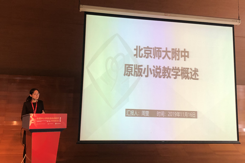 在高中分会场共进行了三个个人发言和三个团队发言,我校教师团队的发言题目为“英语原版小说课堂教学实践”。周雯老师首先对我校英语原版小说教学进行了总体介绍,包括使用原版小说的原因,阅读过的原版小说以及经过多年实践逐渐已成系统化的原版小说教学模式。李玥老师的发言聚焦小说导读课,介绍了不同小说的不同导入方式,并以The Story of My Life为例具体介绍导入课的操作流程。发言过程中,她邀请在场老师扮演学生的角色,类似课堂上的真实互动让参与者切实体会到了导读课的意义。胡文潇老师的发言侧重小说收尾课,除介绍收尾课的基本流程外,她还以Animal Farm为例介绍了收尾课上学生的收获,其中播放的自己依据小说内容制作的视频极具震撼效果。最后,周亚老师做了“基于‘产出导向法’的原版小说读写结合教学探索”的发言。在分享中,周亚老师以小说My Sister’s Keeper小说为例,阐述了如何在设置输出任务的基础上进行课堂教学活动设计,读写结合来促进高质量的语言输入转变为高质量的语言输出。在发言的最后,周亚老师也对这些年来我校进行的原版小说教学进行了几点反思,引起了在场老师的极大共鸣。