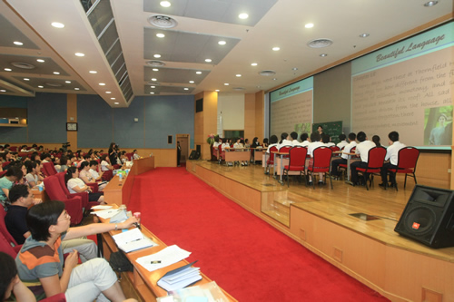 本届研讨会第一次将实验示范课搬上了国家行政学院会议中心的主席台。18日上午,我校张媛媛老师携高一年级19名同学为与会代表带来了生动精彩的英语文学赏析课,将英文名著Jane Eyre 带入了课堂。整堂课设计脉络清晰、主线明确、编排合理、衔接自然、详略得当。张老师简练的英语、悦耳的发音,以及启发性的提问,充分地调动了学生的积极性和学习热情,学生的语感、能力和素养得到了充分的展示和提升。本课受到与会专家和老师们的高度评价,荣获第四届全国基础英语素质教育实验基地学术交流研讨会示范课特等奖,师大附中学生的能力也得到了充分肯定。课后,北京市第二中学英语教研组组长徐红老师这样评价道:“这节课在对教材的处理上,突出了重点、难点,抓住了小说阅读的关键。张媛媛老师的教学方法多样、仪表端庄、举止从容,课堂设计结构严谨、环环相扣、过渡自然,师生关系融洽、和谐,真正让我们看到了英语课堂的典范。”