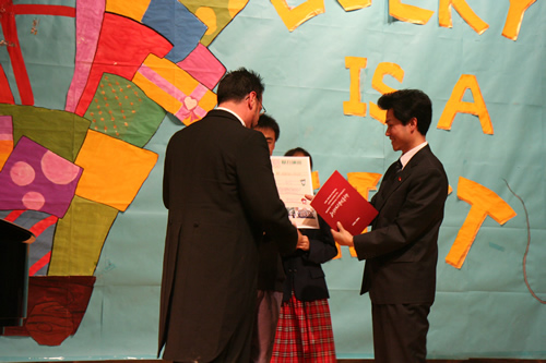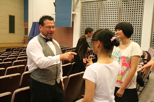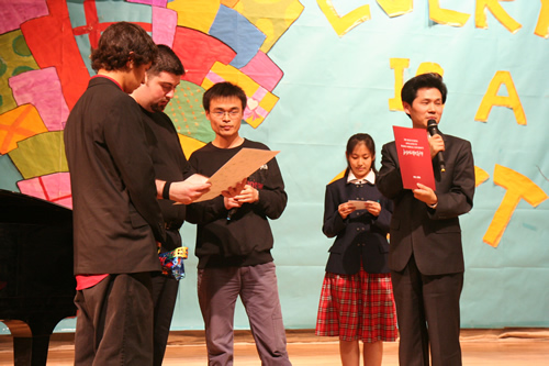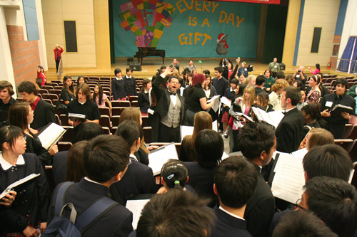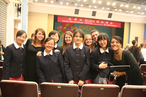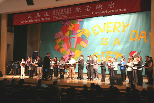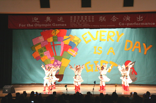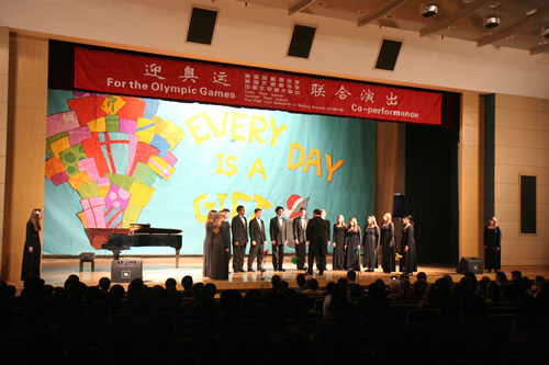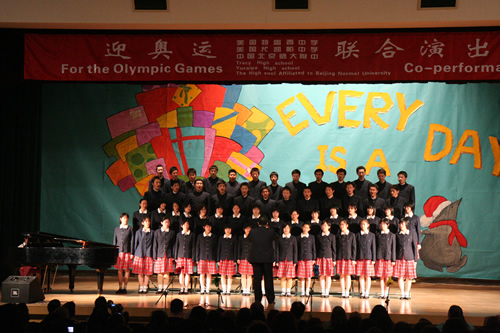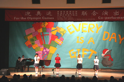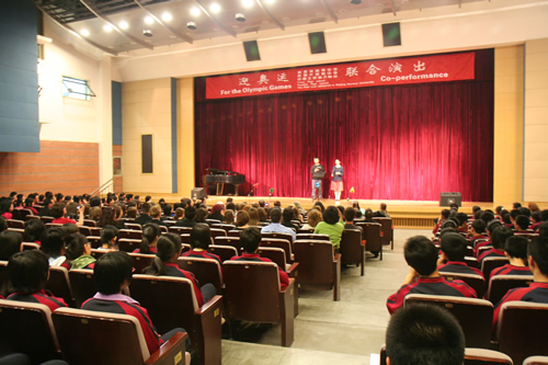 3月17日,美国特蕾西高级中学合唱团和尤凯帕高级中学合唱团来到我校,与我校“附中人”合唱团、青杉舞蹈团进行了“迎奥运・三校联合演出”。美国同学表演了黑人民歌、乡村音乐合唱及无伴奏合唱,他们的演唱赢得了我校师生的热烈掌声。我校高中合唱团及舞蹈团也表演了自己的获奖节目。中国国家交响乐团少年及女子合唱团艺术指导唐重庆老师也参加了此次交流活动,并对三方的表演给予了充分的肯定,最后三校共同合唱中国歌曲《大海啊故乡》,将气氛推向了高潮。