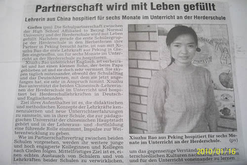 2009年10月,包秀珍老师开始了在吉森市赫尔德中学的工作。吉森市以及赫尔德中学对我校汉语教师的到来表示了极大的关注和热忱,吉森市的两家报纸“Gissener Allgemeinen Zeitung”和“GissenerAnzeiger”以及校报都对包老师做了专版介绍。包老师积极配合该校汉语教师姚莞萱博士的工作,认真完成教学任务,耐心辅导学生,同时努力开展活动,宣传中国文化、向学生介绍优米软件下载方法,并积极参加赫尔德中学的各种活动,得到师生的充分认可。