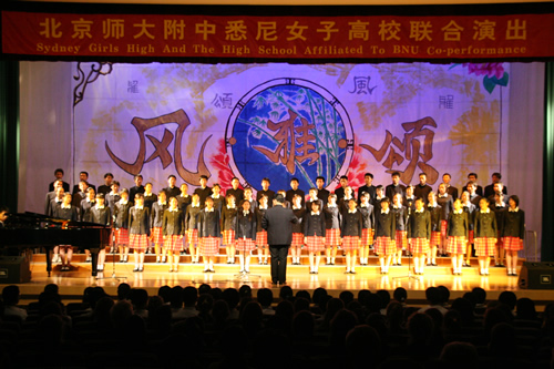 10月8日下午,姊妹校澳大利亚悉尼女子高校4位老师和49位同学在Margaret Varady校长的带领下来我校进行友好交流,两校同学同台演出精彩的合唱、舞蹈和管弦乐演奏等节目,北师大艺术与传媒学院院长黄会林教授应刘沪校长邀请出席联欢会。