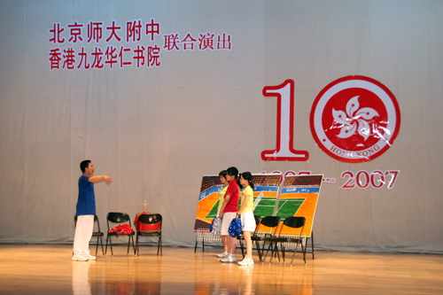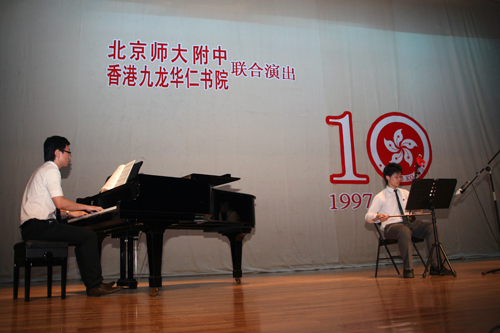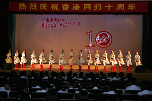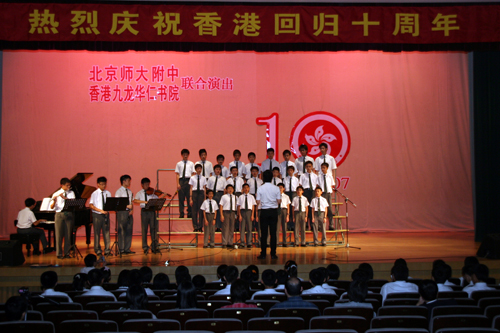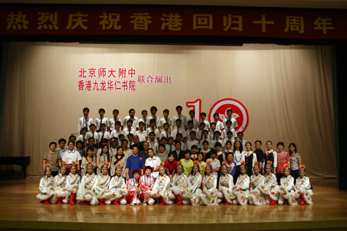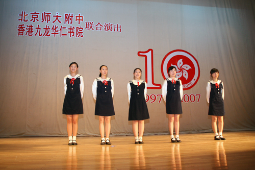 我校与香港九龙华仁书院自2004年12月结成姊妹校以来,不断扩大和加深学校间的合作关系,一直保持着良好的师生互动交流。在庆祝香港回归十周年之际,香港九龙华仁书院师生一行40人来我校进行友好访问,两校同学在附中百年会堂共同表演了精彩的节目。