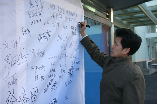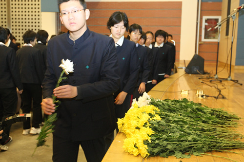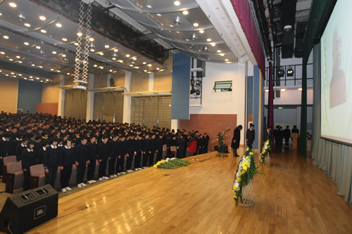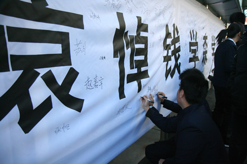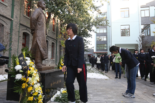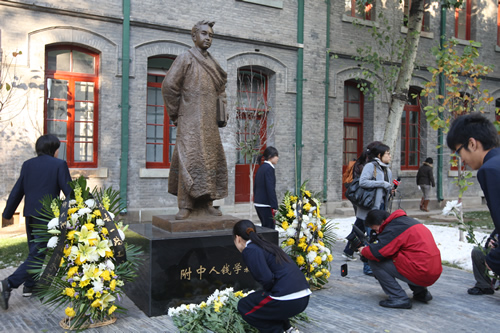 庄严的升旗仪式之后,全校师生为钱学森校友默哀一分钟。刘沪校长代表学校向全校师生介绍了钱学森校友生平,深情回顾了钱老及其家人与附中的联系,表达了全校师生对国家痛失栋梁的哀痛之情。他号召全校同学以钱学森为榜样,树立爱国大志,全面发展,以实际行动纪念钱学森学长。学生代表高二10班冯子航同学发言,表示要以钱学森学长为榜样,努力成才,报效祖国。集会后同学们纷纷在巨型条幅上写下对老学长的无比崇敬与无限哀思。随后同学们来到校园内的钱学森铜像前献上鲜花,并参观学校刚刚落成的钱学森展览馆,深情缅怀这位对国家民族做出了巨大贡献的杰出学长。