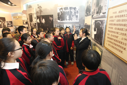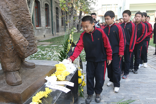巨星陨落,举国痛惜。我校师生自发组织各种悼念活动,11月3日,初一年级同学们收看了关于钱老生平的纪录片。 钱老高尚的爱国主义精神,积极创新的精神和自强不息几十年如一日默默奉献的精神,深深触动了同学们。同学们将自己亲手制作的朵朵白花满怀深情摆放在钱学森雕像前,祭奠前辈,表达无比崇敬和无限哀思。随后同学们参观了钱学森纪念馆,缅怀为我们留下了无数精神财富的老校友,同学们表示要以钱学森学长为榜样,努力成才,报效祖国。