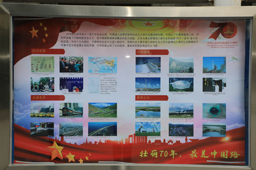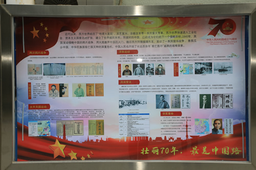由梁原草副校长策划、学生成长指导中心的老师们收集材料、组织筹办的宣传橱窗,对一百多年来中国人民探索拯救民族危亡和探索民族复兴道路的艰难历程和壮丽图景进行了清晰展示。学生们通过橱窗的展示了解了70年来共和国由站起来、富起来到强起来的复兴之路。