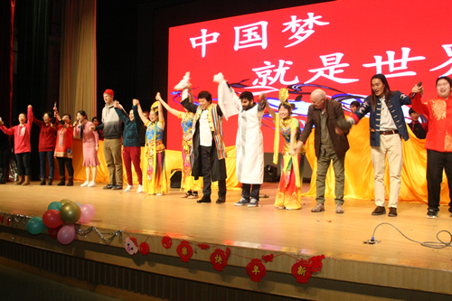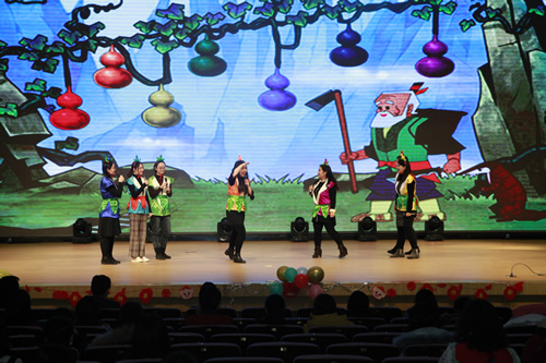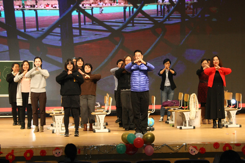 今年国际部的节目《丝路中国梦》是前不久刚刚在北京市留学生汉语节表演中获得一等奖的节目。节目以配乐朗诵、歌舞表演、评书小品等多种艺术形式,分三幕展现了中国的古代辉煌与现代辉煌,并从一个欧洲留学生的视角,表现了“中国梦就是世界梦”这一主题。节目主题的“高大上”,让老师们深深为祖国的日益繁荣昌盛感到由衷的自豪。