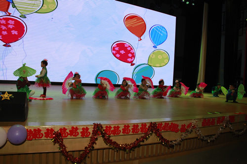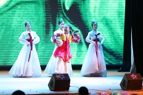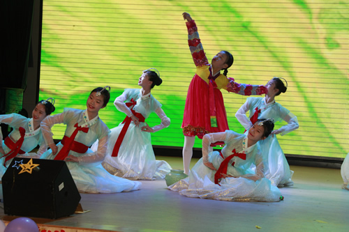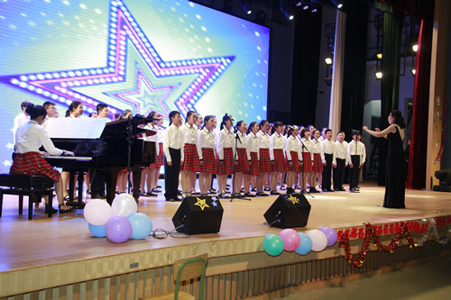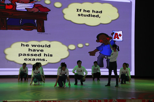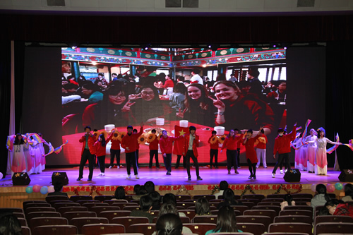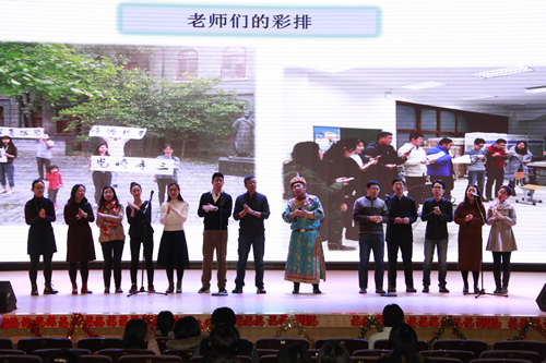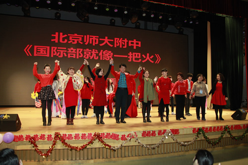 今年国际部的节目先是由国际部老师们演唱自主填词改编的《国际部小调》,以歌词和视频的方式向大家展示留学生在附中丰富多彩的学习生活;接着师生同台演唱经典摇滚《冬天里的一把火》,配以留学生们热情洋溢的伴舞,场上朵朵向日葵摇摆、面面国旗飞扬,场面轰轰烈烈、红红火火,博得台下观众的阵阵掌声。