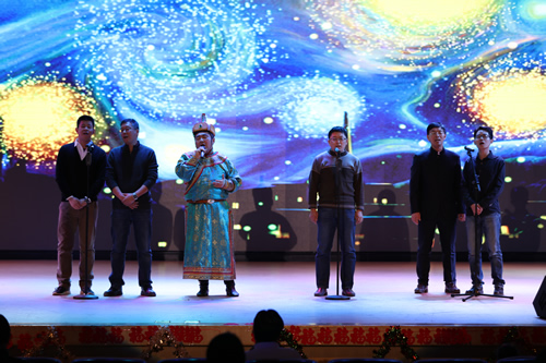 初三年级组为大家献上经典民歌《乌兰巴托之夜》。歌曲首先由白朝鲁老师身着蒙古服,动人地用蒙语演唱;随即初三年级组的男老师们陆续上台,用汉语温柔地唱出了对乌兰巴托的向往和眷恋,令场下观众陶醉在悠扬宁静的歌声中。