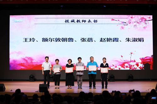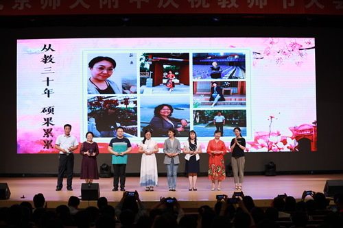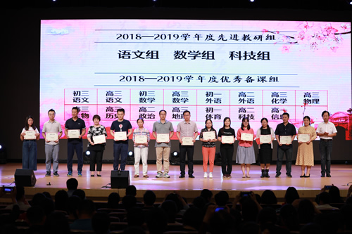 过去的一年中附中的教师兢兢业业、勤恳努力在各个方面取得了优异的成绩,学校领导为过去一个年度我校的先进教研组、优秀备课组、优秀集体、优秀教师、优秀教育工作者、北京市紫禁杯班主任、西城区优秀班主任荣誉称号获得者颁发奖状,学生代表敬献鲜花。过去三年,我校共派出5位援藏教师,他们远在他乡代表师大附中为祖国的教师事业奉献青春,为藏区的教育作业做出了突出的贡献,深受当地政府和教委的表彰,学校为他们颁发了奖状。