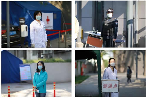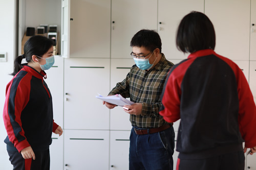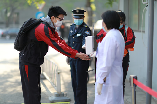 早晨7:00 老师和同学们陆陆续续抵达学校,在校门口消毒并检测体温。