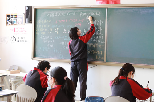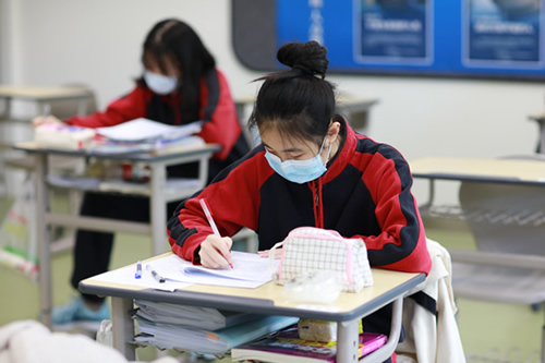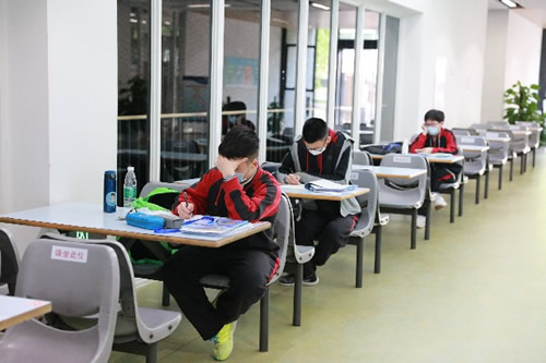 早晨8:00 同学们有序进入教学楼和教室,有的安静自习,有的整理教室,有的在黑板上写下鼓励的话语。