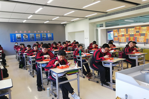 午餐时间,老师们把午餐送到教室门口,同学们有序取餐并就餐。其间,班主任老师为同学们逐个测量体温,完成午检。