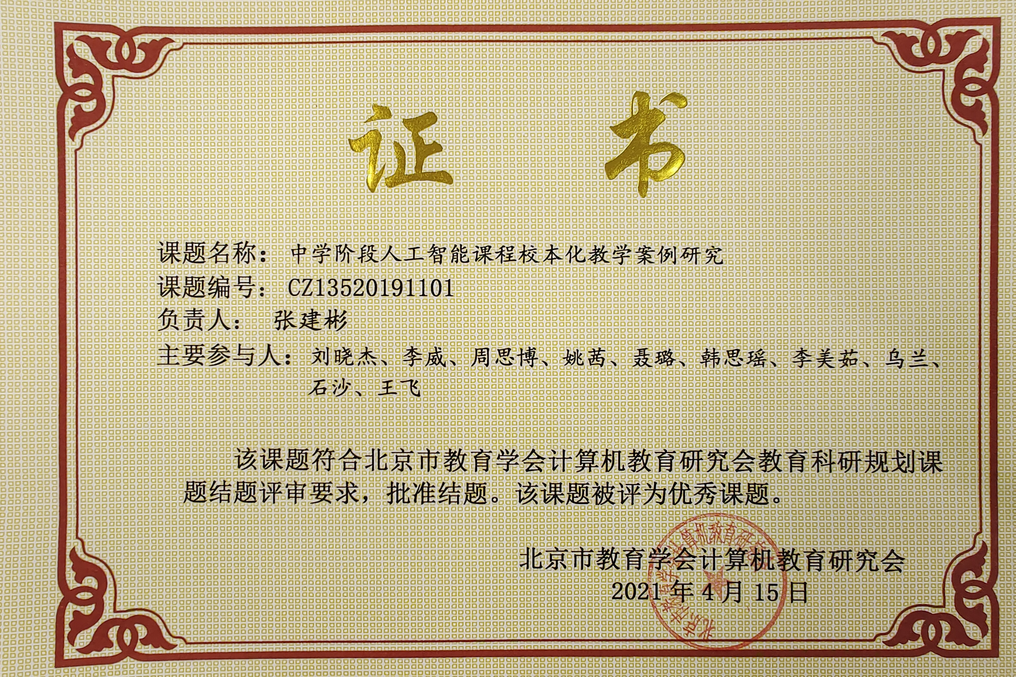 《中学阶段人工智能课程校本化教学案例研究》这一课题由我校信息教研组牵头,联合北京十一学校、人大附中第二分校、首师大附中二分校教师共同完成,顺利通过结题答辩并被评为优秀课题。