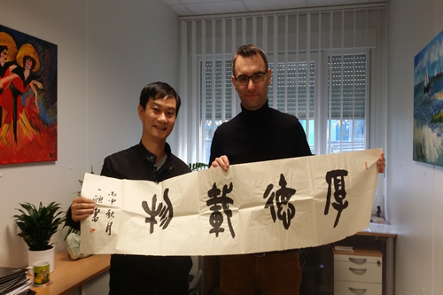 2016-2017学年,我校语文组龙军老师受国家汉办孔子学院委派远赴德国友好校赫尔德文理中学工作。龙军老师协助该校老师开展汉语教学及相关活动,除了承担十一年级的中文教学任务,还独立承办了“文化活动周——中国文化体验活动”,系统开展了中国书法鉴赏与书写、中国篆刻艺术与名章制作、中国国画欣赏与年画及脸谱创作、中国剪纸艺术欣赏与平面立体剪纸创作、中国灯笼制作、中国年节文化等相关主题的教学活动,引起了学生的较大兴趣。学生们纷纷表示对中国文化的理解又有了新的体会和认识,还拿来相关中文书籍来互相交流。该校校长Tross先生对汉语教学和文化周活动都较为重视,亲自莅临指导相关工作,与龙老师就中国文化及中文教学的相关问题进行了多次友好热烈的讨论交流,并对龙老师的工作表示了感谢。
