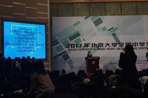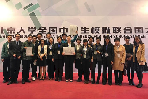 2017年北京大学全国中学生模拟联合国大会于3月16-19日在北京大学举行,我校模联社团获得最佳组织奖,韩放同学获得最佳前瞻报告奖,张晓昱同学获得最佳陈述报告奖。