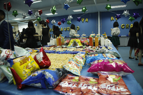 在这之后,同学们迎来了毕业派对的后半部分:Party。他们精心制作和准备了诸多美食,认真策划了各种游戏,毕业派对在一片欢笑声中结束。