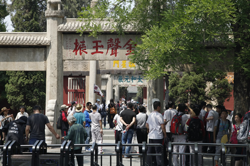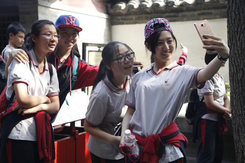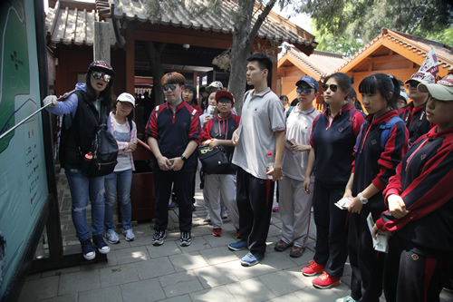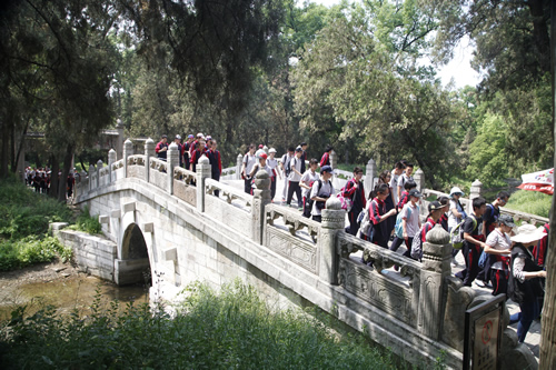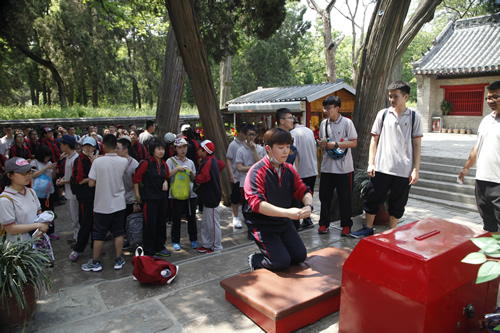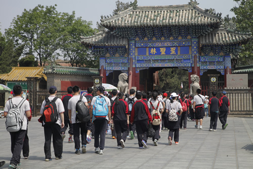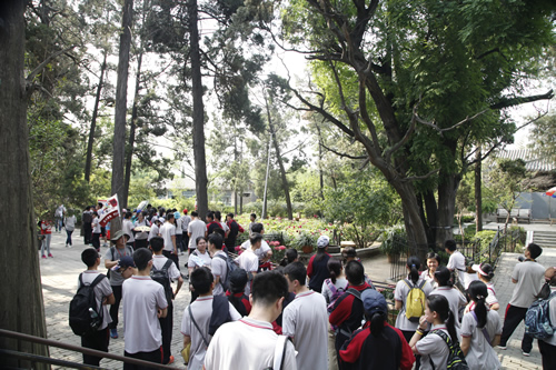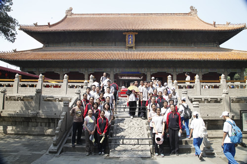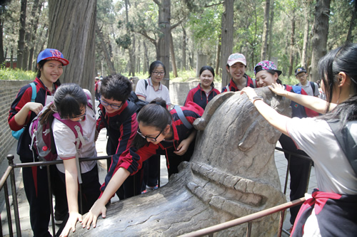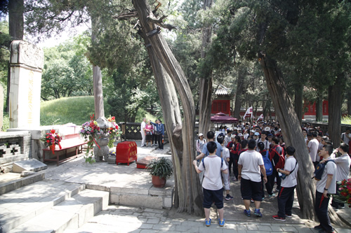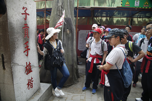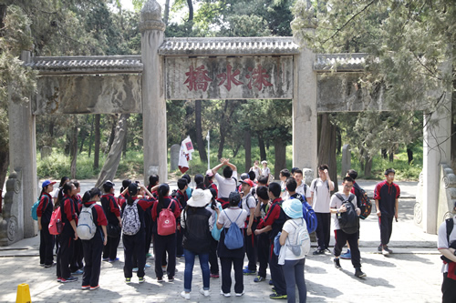 游学的第一站是曲阜的“三孔”景区。“三孔”即孔林、孔庙与孔府的合称,是中国历代纪念孔子、推崇儒学的象征。孔林本称至圣林,是儒家学派代表人物孔子及其家族的墓地。天气炎热,但同学们拜谒儒家大师、体味儒家文化的兴致丝毫不减。孔林中立满了孔子弟子为答谢老师培养而栽种的树木,种类繁多,郁郁苍苍。阴阴翠润之下,同学们不禁放慢了脚步,为这种师生间的情感和学子的尊师精神而触动,对儒家文化也有了进一步的思考。