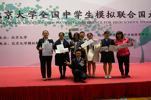 2016年北京大学全国中学生模拟联合国大会(Peking University National Model United Nations Conference for High School Students, PKUNMUN)于3月24日~27日在北京大学举行,我校同学获得北大模联会最佳代表等多项奖。