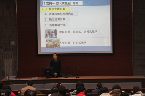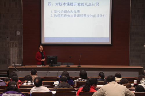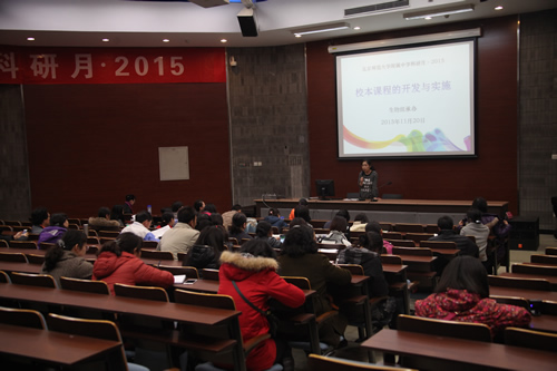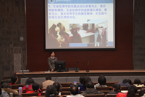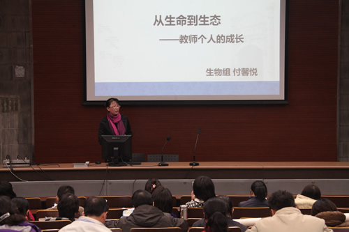 生物组分会场的活动由教学教研处郑一丹副主任主持。生物教研组以“中学生态伦理学”为例,较为全面地展示了此门校本课程的开发与实践研究。教研组长卓婧老师简要地介绍了这门校本课程开发的背景,以及在探索过程中的思考与体会。李建芝老师重点介绍了课题组基于课程设计的“情境模式”这一理论基础所开展的实践研究。刘晓燕老师从校本课程和国家课程两个角度谈及了生物组在教学方式上的创新。付馨悦老师结合自身在“中学生态伦理学”开发过程中所取得的教科研成果,与会场的老师们交流了自己的专业成长过程,得到了全场老师的鼓励与肯定。