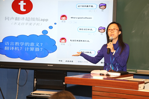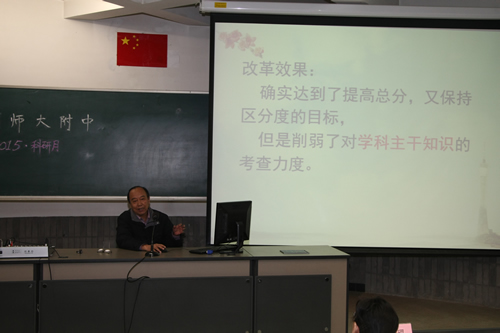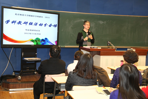 英语组分会场的活动由教学教研处冯健主任主持。初高中英语教师的代表对近年来她们教学改革的尝试进行了精彩阐述。杜志娴老师结合对学习力要素的分析,介绍了以“合趣”为核心的初中英语教学及课程体系的构建;郭文涛老师以“小小的贴画”切入,分享了一位年轻教师在学科教学评价方面的研究与探索;高二英语备课组四位老师周亚、蔡静、林婷婷、刘理花“轮番上阵”,在强调英语工具性与人文性统一的同时,展示出令人耳目一新的高中英语教学面貌。北京市基教研中心陈新忠老师对此次活动进行了点评,他认为附中英语组已经走在了北京市英语教学改革的前列,影响很大,促使整个北京英语教学界在思考英语教学到底应该往哪个方向走;并指出附中英语组的探索体现了她们在语言观和教育观方面的巨大变化,即致力于让学生学文化、做文化人,且呈现出语言和文化、思维、审美间的关系,这些都是高中英语课改所倡导的,也会跟未来的新的课程标准相吻合;教师情怀、好的协作团队和学校领导的支持是促成这些改变的重要条件。