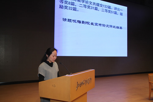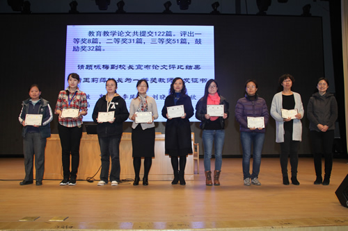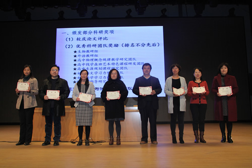 上半场,冯主任首先公布了本年度论文评选结果。此次共评出一等奖8篇,二等奖31篇,三等奖51篇,鼓励奖32篇。顾咏梅副校长宣读了获奖名单,王莉萍校长为获得一等奖的教师颁发了证书。随后梁原草副校长为本学年度的八个优秀教学研究团队颁奖,许建勇书记为学校“十三五”课题所聘请的兼职科研员老师颁发了聘书。