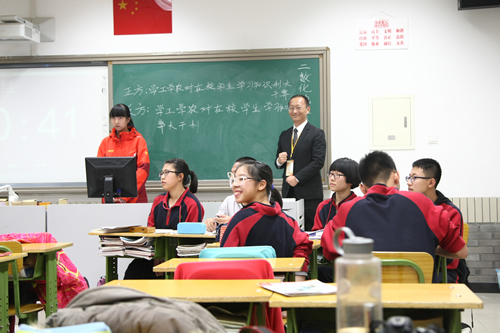欢迎仪式结束后,台南一中师生分成18个组,分别按照自己的意愿,进入我校高一、高二班随堂学习。下课后,在交流中心老师们的带领下参观我校的杏坛、三味书屋和钱学森纪念馆等文化设施,也观摩了我校丰富多彩的选修课,如生物园的小麦种植,物理、化学、生物、计算机实验室、美术教室、舞蹈教室的特色课程,在音乐教室,正在上课的学生即兴为来自台湾的师生高歌一曲,引发台湾师生的热烈掌声。在科技教室,张添唐校长带领学生驻足许久,不仅亲自动手参与了实验,而且当看到2014年9月我校翱翔计划师生团去台南一中参观学习时的照片时更是兴奋不已。参观学习过程中,两校师生互动热烈、收获颇深。