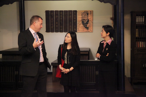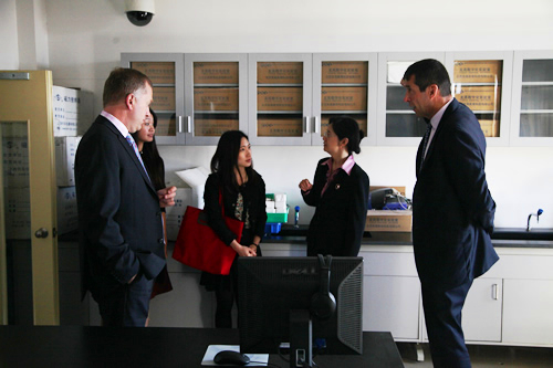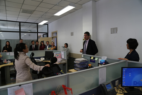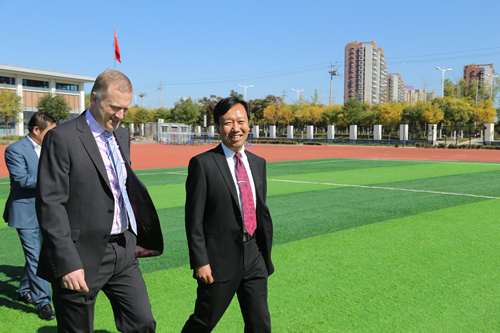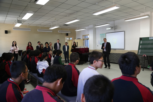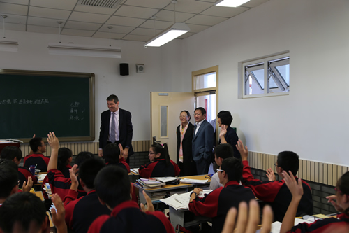 中午时分,总裁一行到访优米软件下载方法平谷第一分校。平谷区教委主任李学东、副主任徐皝会见来宾,优米软件下载方法副校长李敏、平谷一分校执行校长李磊、副校长董长华、副校长刘莉娟陪同会见来宾。Mr. Mark Stanton和Mr. Stuart White走进一分校的语文和音乐课堂,并与师生展开亲切互动。Mr. Mark Stanton还与在校交流的美国留学生针对跨文化学习展开简短讨论。此外,他们参观了学校的生物实验室、电脑机房、操场、食堂及学生宿舍,对设备的配置、使用及维护给予了高度认可。当看到平谷一分校在建校初期获得诸多国家级、市级、区级荣誉时,来宾们深表赞叹。