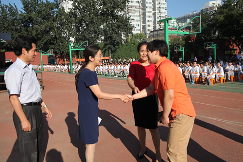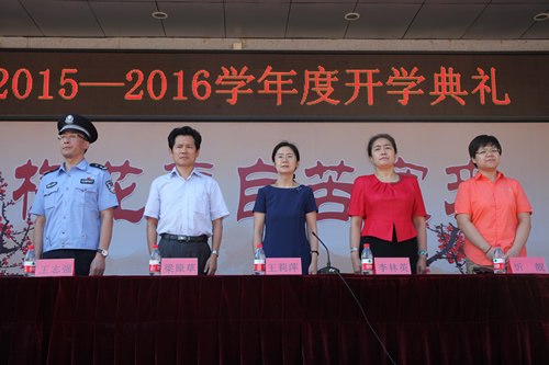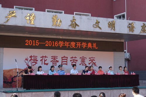 首先是升国旗仪式,伴着庄严的国歌,全场肃立,鲜红的五星红旗在阳光照耀下无比艳丽。随后是王莉萍校长致辞,王校长首先表达对中国人民抗日战争暨世界反法西斯战争胜利70周年盛大阅兵典礼的感受,鼓励青少年应树爱国之心,立报国之志,成栋梁之才,以“为国为人 我之责任”的精神无悔投入到新学期的学习和生活中!对于北师大附中南校区的建立,她也表达了共同发展,共同进步的愿景。