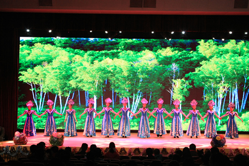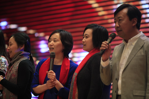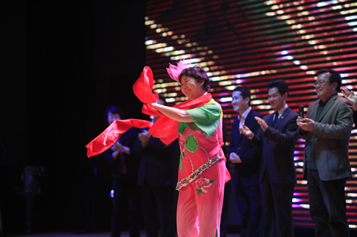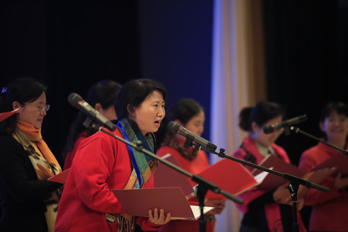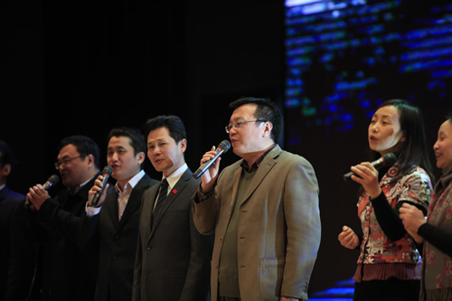 校领导们合唱《大中国》,歌声浑厚悠扬,更是有优美的舞姿相伴,好不活泼热闹!掀起了晚会的第一个高潮。