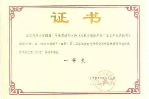 王雪瑞老师《火柴头燃烧产物中某些产物的探究》获得北京市西城区(南区)第二届优秀课堂教学设计一等奖,本届课堂教学设计南区共评出两个一等奖,获得一等奖的教学设计将入围市级评比。