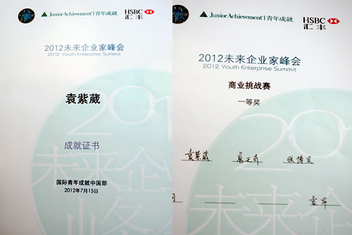 2012年7月13至16日,我校政治组马机麟老师带领四名高一学生邯翘、康佳华、康殷实、袁紫葳赴上海,参加“JA中国2012未来企业家峰会”。我校袁紫葳同学场上表现优异,她和她所在公司在来自全国10几个城市160多名学生参加的商业挑战赛上荣获一等奖;邯翘同学在这次未来企业家峰会上获得商业创新方案大赛第三名。