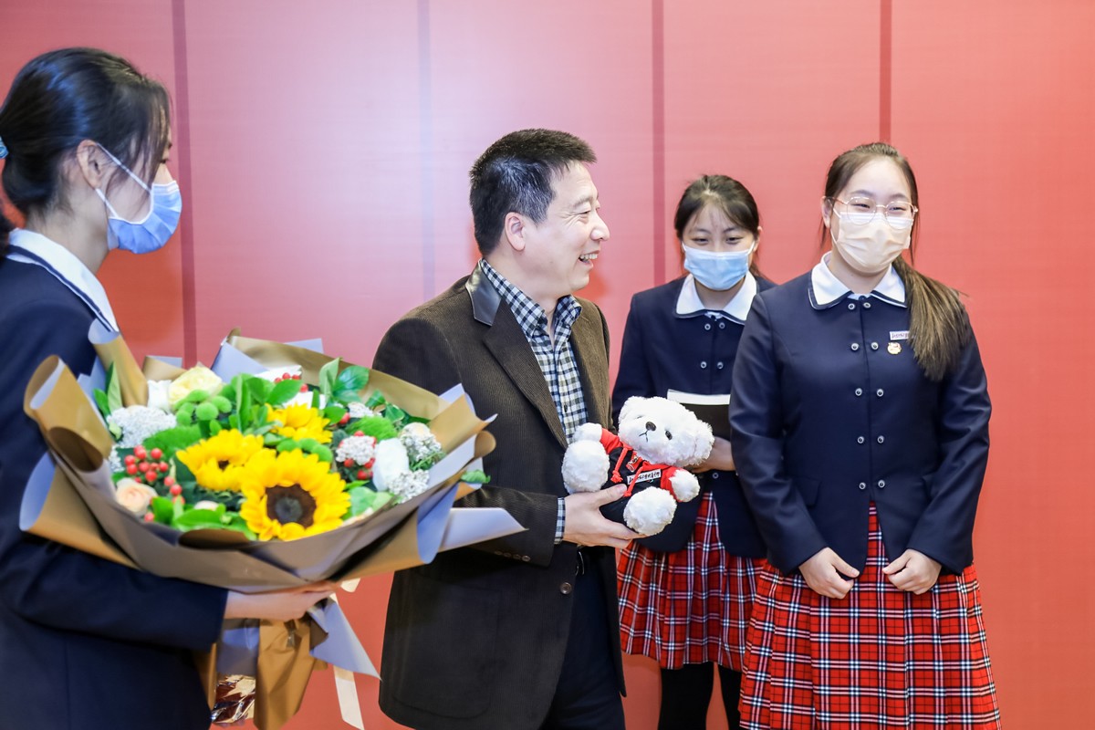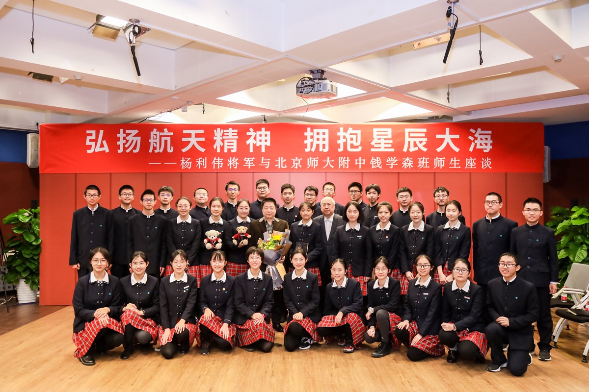 座谈给了同学们很多启发和思考,同学们的提问也得到杨将军的高度赞扬。座谈后钱学森班同学代表向杨利伟将军献花致谢并赠送纪念品,杨将军也欣然受邀与同学们合影留念。座谈后杨利伟将军在钱永刚教授、王莉萍校长等陪同下参观了我校钱学森纪念馆。
