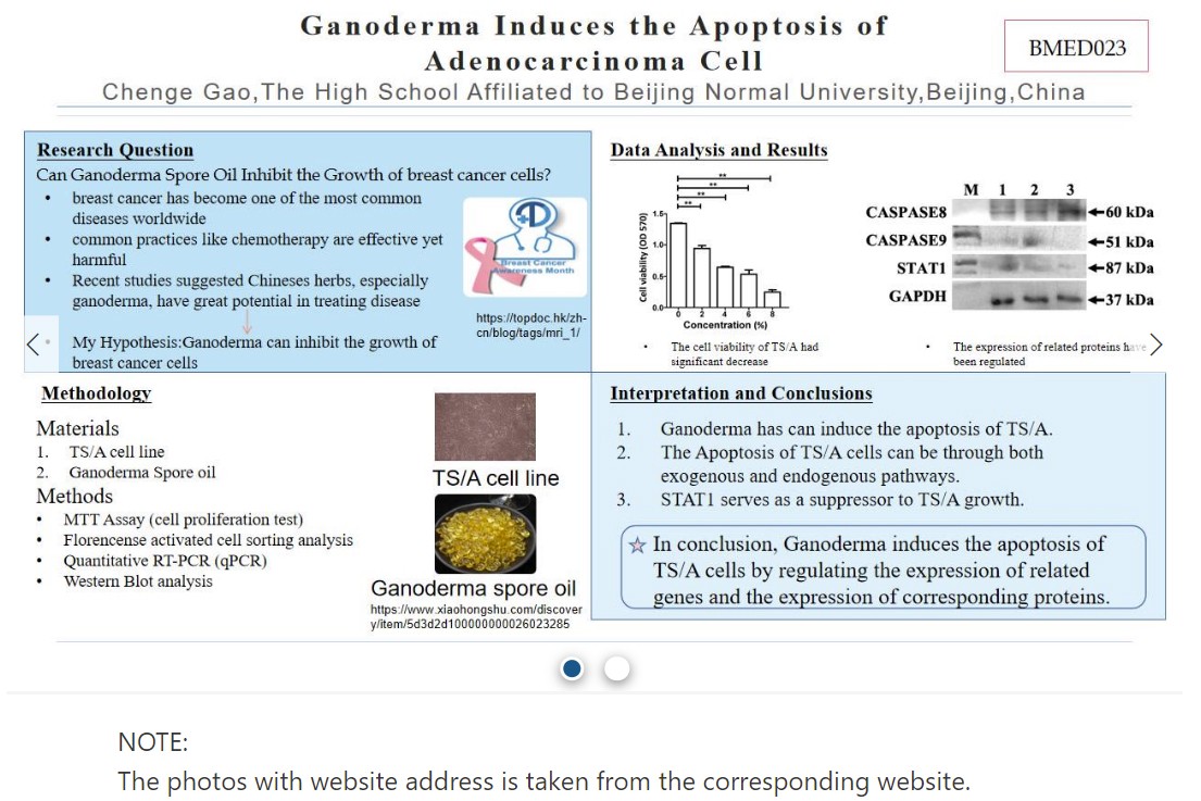ISEF作为全球级别高水平的中学生科技竞赛,每年有大约700万学生参与,今年最终共有1750名来自全球63个国家及地区的选手入围总决赛,入围率不到万分之三,北京市共有9个学生项目入围。高辰歌同学作为我校金鹏科技团成员,在中国科学院生物物理所陶宁导师的实验室完成了研究课题《Ganoderma Induces the Apoptosis of Cancer Cells》(《灵芝孢子油抑制乳腺癌生长效应研究》)。2021年12月,高辰歌同学在全国英才计划论坛(生物)中脱颖而出,获得优秀学员称号并入选ISEF冬令营。2022年1月,她通过ISEF冬令营的筛选,成功入围第72届ISEF全球总决赛。20222月-5月,高辰歌同学进行了充分的参赛准备,补充实验、提交参赛的各项材料、布置线上展板等,最终顺利完成答辩,充分展现了我校高中生的风采和对科学研究的热情。