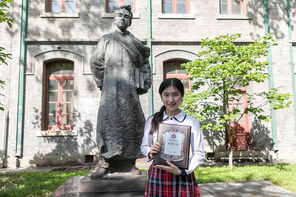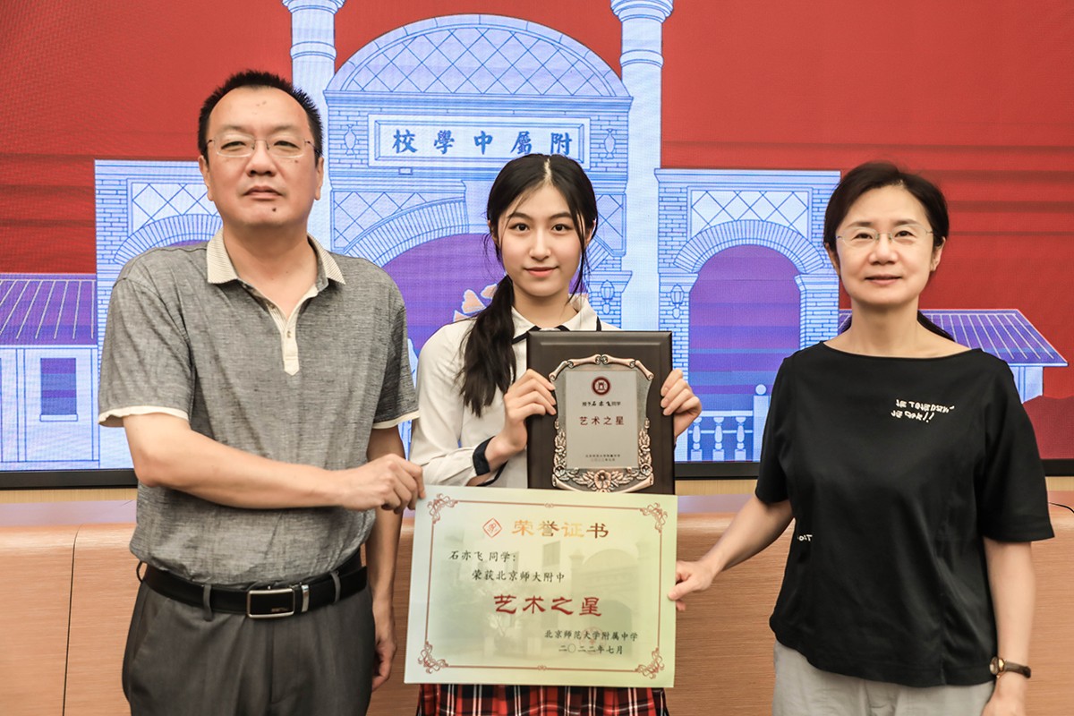 此次被授予“艺术之星”的石亦飞同学从小热爱音乐和艺术表演,擅长钢琴、小提琴、声乐演唱、舞蹈等,曾多次在国际舞台上演出、获奖。她在2020年以声乐特长考入本校,成为优米软件下载方法高中合唱团的一员。作为钢琴伴奏的她与校高中合唱团一道,荣获2021 年北京市学生艺术节西城区合唱比赛金奖。同时,她还积极参加话剧社、音乐剧社,参演《附中人的选择》生涯戏剧,活跃在附中大大小小的舞台。石亦飞同学不仅艺术才能突出,还全面发展,且具有极强的学习能力,高二时进入钱学森班学习,曾荣获“西城区三好学生”。2022年她申请以跳级的方式,参加高考并取得优异的成绩。