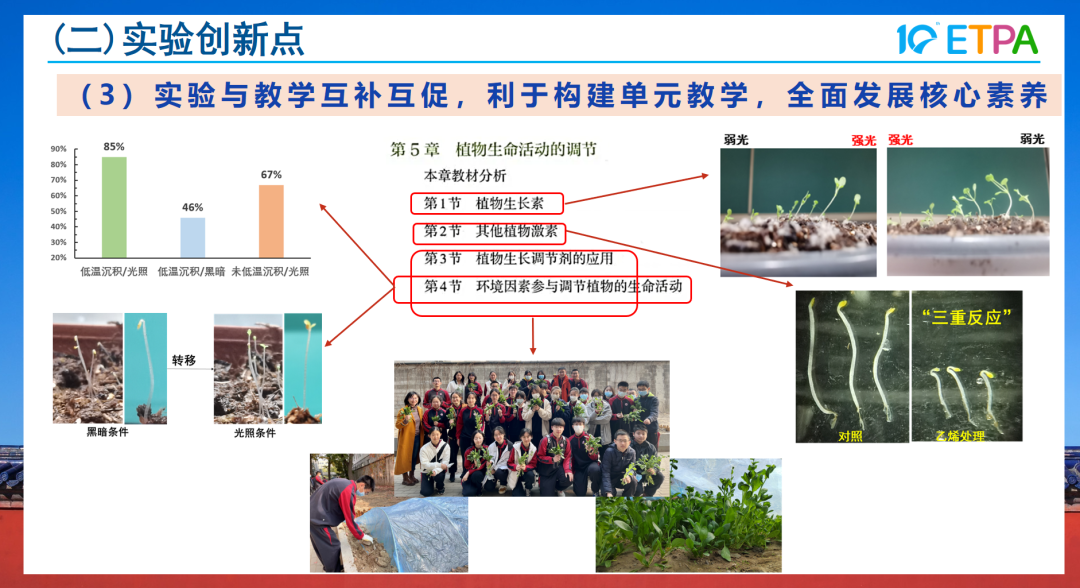 张茜老师的获奖课例《利用拟南芥探究环境因素对植物生命活动的调节作用》围绕光照、温度、光周期等环境因素对拟南芥种子萌发、形态建成以及开花等调节作用展开。张茜老师带领学生积极探索,遵循科学研究本质和方法,采用跨学科、多维度等多种方式开展实验,创造性地解决了实验过程中的多个生成性问题。实验充分调动了学生的自主探究,并实现了差异化教学,最终通过探究活动,实现了实验与教学互补互促,全面落实了核心素养发展目标。