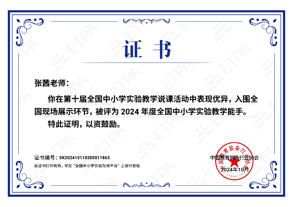近日,由教育部基础教育司主办的第十届全国中小学实验教学说课活动获奖结果出炉。我校张茜老师经过区级、市级、国家级层层选拔,入围第十届全国中小学实验教学说课活动现场展示环节,并斩获 “2024年度全国中小学实验教学能手”称号。
