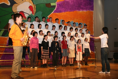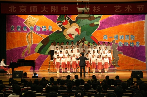 4月3日下午,我校在礼堂举办了“唱响国歌”高一年级歌咏比赛。这次大赛由高一年级组和校团委联合主办,是本届“青杉”艺术节的又一项重大赛事,也是为迎接北京奥运会而开展的一项爱国主义教育活动。比赛要求必须演唱一首国歌或者校歌,另一曲目自定。担任评委的有艺术组齐宏老师、张秀玲老师、陈卓老师以及冯希奇老师。高一9班以精彩的演出获得一等奖;高一6班和11班获二等奖。赛后,齐宏老师做了点评;刘沪校长和王玉清校长为获奖的班级颁发了奖状。