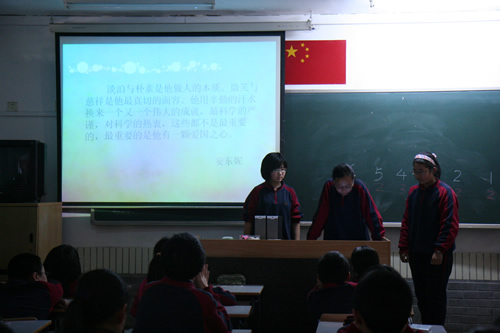 活动中,各班通过分组校园探秘――寻找校园内有关钱学森的信息,阅读有关钱学森的故事,布置班级板报,模仿《感动中国》给钱学森写颁奖词,举行主题班会等形式,大力宣扬钱学森热爱祖国、刻苦求学和淡泊名利的精神,使学生认识到每位伟人在聚光灯后都经历了艰苦的成长历程,引导学生树立正确的人生观、价值观。通过此次活动,每个学生都真切地体会到了钱学森的爱国情怀,使同学们真正走“近”了钱学森。同时也使学生们,洗涤了心灵,振奋了精神,明确了方向。