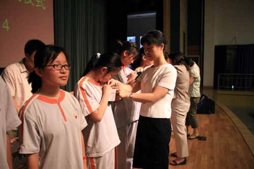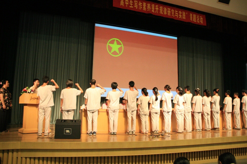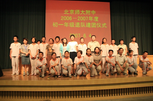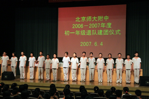 6月4日下午,初一年级同学佩戴着鲜艳的领巾汇集在礼堂,参加退队建团仪式。年级组长赵老师宣布仪式开始,当《中国少年先锋队队歌》奏起时,同学们举起右手行队礼,目送队旗,告别少先队,摘下红领巾。接着,《中国共产主义青年团团歌》奏起,仿佛把同学们引领到神圣的殿堂,神游豪迈的革命情怀。在鲜血染成的团旗的映衬下,16名同学光荣入团,成为第一批团员。他们是:一班,白杨、马啸;二班,张博雅、王宁;三班,尹长宇、王叶楠;四班,周雨珊、魏林川;五班,吴凡、刘童;六班,刘卓、彭程;七班,尹鑫洋、范鸿仪;八班,宋明育、慕洋。在《团歌》声中,16名同学激动的接受了中国共产主义青年团团证和团徽,并在团旗下庄严宣誓。随后,彭程同学代表新团员慷慨地表明了他们决心。团委书记买峥峥同学发表了讲话,她衷心祝贺新团员的加入,鼓舞他们更加严格要求自己,更希望其他同学积极争取入团。建团仪式在雄壮的《国际歌》声中结束了。