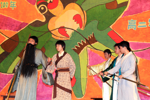 5月18日、22日,高二年级组和高二语文备课组在学校礼堂举办了“2007师大附中话剧节”。此次展演是为了纪念中国话剧诞辰100周年并配合语文戏剧单元的教学。展演节目既有《雷雨》这样常演不衰的经典篇目,也有改编自《三国》、《水浒》、《简爱》、《福尔摩斯》等文学巨著的篇目,更有同学们自己的原创作品。为了鼓励同学们的创作、演出热情,分别设立了最佳表演奖、优秀剧作奖和最佳舞台设计奖。同学们扎实排练,认真准备,两场演出精彩纷呈,高潮迭起,整个活动圆满成功。通过此次展演,同学们提升了创作热情,锻炼了舞台演技,也大大增强了对戏剧这种文学样式的了解。