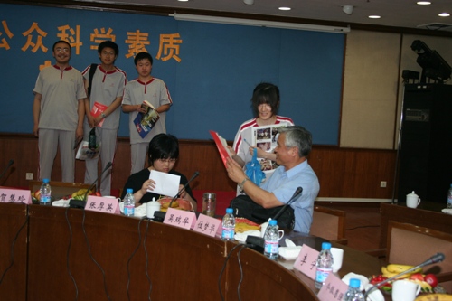 5月17日,由市科协、北京科技报社共同组织的“科学家与公众科学素质沙龙”在北京市科技活动中心举行。我校高二学生王英骁、艾鑫,高一学生吴田华、李士依,在教导处刘岩老师的带领下参加了此次活动。与会人员包括市科协主席、中科院院士、清华大学校长顾秉林教授等六位资深科普工作的老科学家,来自各个领域的有突出贡献的青年科学家、媒体记者以及各中学科学社的学生代表。大家汇聚一堂,共同研究探讨我国科普工作的开展与提高公众科学素质的问题。