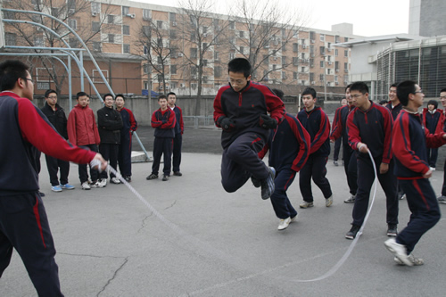 获得各年级跳绳1分钟单摇冠军的是:初一6李雨晨202次,初二5刘瀚文218次,高一孔君218次,高二3翟文博230次。