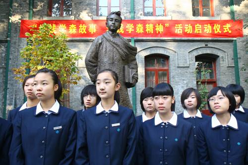 “讲钱学森故事,学钱学森精神”是学校向钱老学习的系列活动之一。刘沪校长在致辞中表示,为了更好地向钱学森先生学习,发扬钱学森精神,学校决定结合青少年特点,开展“讲钱学森故事,学钱学森精神”活动。他说,师大附中是钱老的中学母校,要率先向钱学森学习,学校才无愧于钱老的母校,我们才无愧于钱老的校友。学校将以班会、演讲会、板报、橱窗展、国旗下讲话、参观钱学森纪念馆、观看大型文献纪录片《钱学森》等形式,让学生探寻钱学森的成长道路和人生经历,了解一位杰出科学家和伟大爱国者的言行事迹和精神世界。通过同学们多种方式的实践参与,从中受到教育感染,自己得出结论,应当向钱学森校友学习哪些精神。