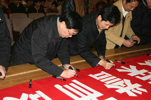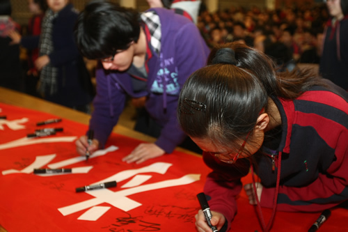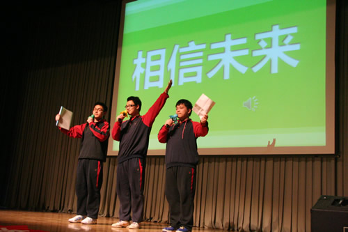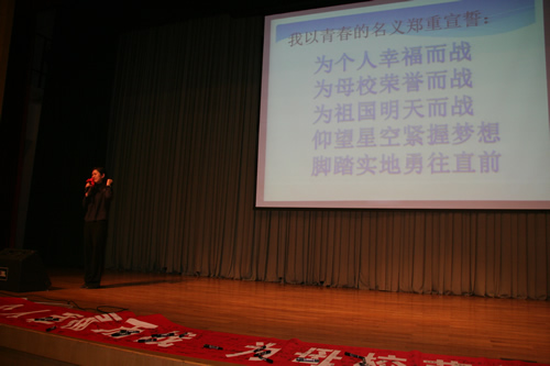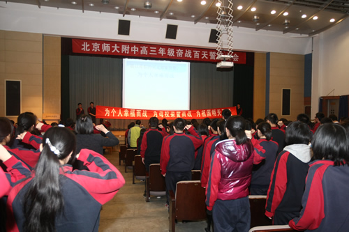 在距离高考100天的日子里,高三年级全体师生在优米体育总部地址电话会堂举行了奋战百天誓师大会。同学们深情朗诵了朱自清的散文《匆匆》、食指的诗歌《相信未来》,表达自己珍惜时间、不怕挫折、勇迎挑战的豪情和信念。各备课组教师为同学们送上了精心准备的幻灯片,表示要作同学们的坚强后盾。年级组长刘美玲老师激励同学们不忘父母的养育之恩、不忘附中的培育之恩、不忘中华儿女的责任和使命,全力拼搏,接受祖国检验和挑选。最后全体师生庄严宣誓:为个人幸福而战,为母校荣誉而战,为祖国明天而战! 刘沪校长等领导与高三师生一起在写有上述誓言的横幅上签名。