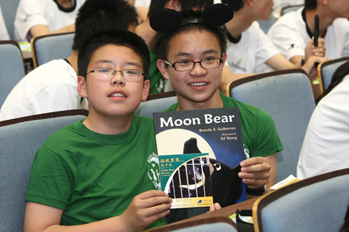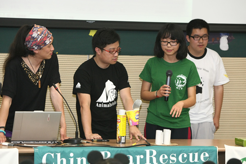 活动当天,所有参与活动的同学都身着根与芽与亚洲动物基金赠送的文化衫。活动开场,身穿可爱月熊服装的高三学长来到场内与同学们进行亲密互动;亚洲动物基金会高级教育主管Jacky向同学们讲述了亚洲动物基金保护黑熊的故事和经历,并带领同学们当场制作了月熊玩具。同学们做成的新颖玩具以及全校师生抵制熊胆制品的签名都赠送给了根与芽北京办公室。