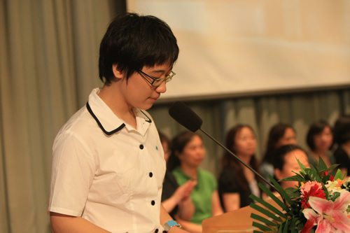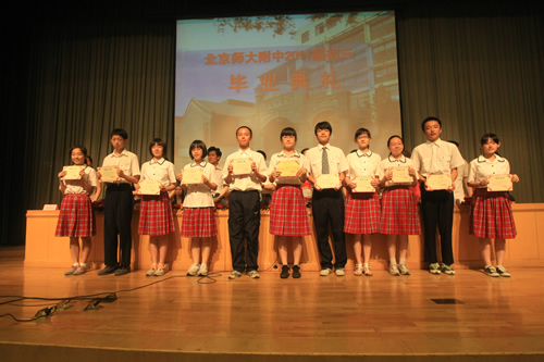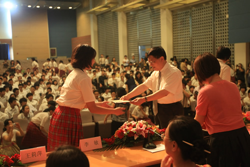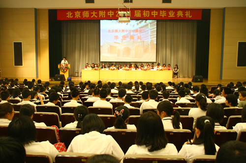 典礼开始前,大屏幕上放映了全体初三毕业生三年来生活点滴的照片合集。在优美舒缓的背景音乐中,许多同学回忆起初中生活的一幕幕,不禁流下了眼泪。 毕业典礼开始后,梁原草副校长宣布了各项获奖名单,校领导们为表现优异的个人和集体颁奖。领奖的同学们的脸上都挂着自豪和喜悦的笑容,台下热烈的掌声经久不息。
