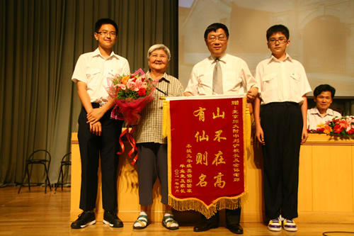 毕业典礼中,初三六班伍宇镭同学的奶奶陈积英奶奶也来到了会场,并为学校赠送了锦旗。陈积英奶奶是我校著名校友钱学森先生的老部下,陈奶奶谈起过去的往事和对附中的崇敬时都十分激动,并鼓励同学们要让“明日附中以我为荣”。